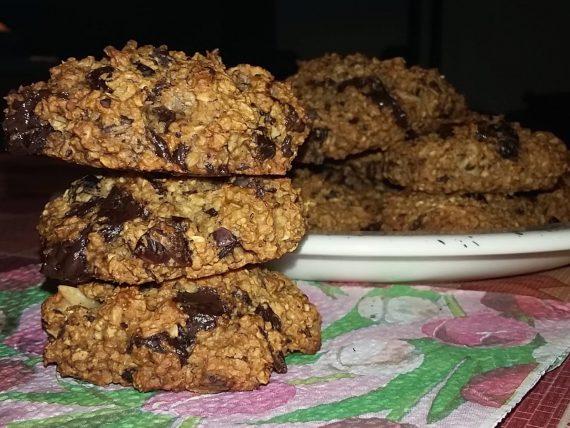 Πλάθουμε το μείγμα μας σε μικρές μπαλίτσες και τις πατάμε με τις παλάμες μας για να απλώσουν και να μοιάζουν με μπισκότα. Ψήνουμε τα μπισκότα μας σε προθερμασμένο φούρνο στους 180 βαθμούς Κελσίου για 10 με 12 λεπτά σε ένα ταψί με λαδόκολλα.
