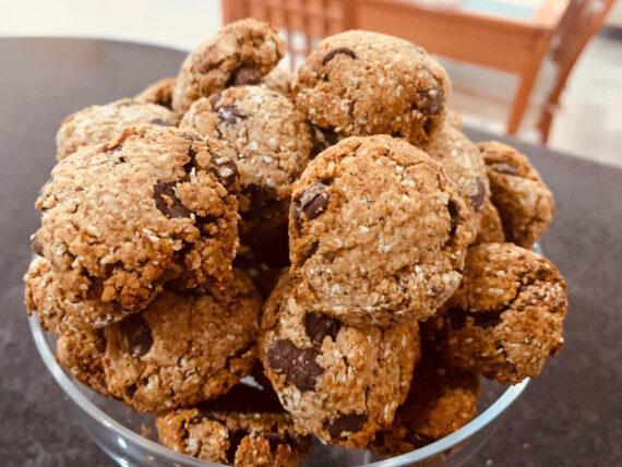 Πλάθουμε το μείγμα σε μπισκοτάκια και τα βάζουμε σε ένα ταψί με λαδόκολλα. Τα πατάμε ελαφρώς με το χέρι και τα ψήνουμε σε προθερμασμένο φούρνο στους 180 βαθμούς Κελσίου στις αντιστάσεις για 10-12 λεπτά.