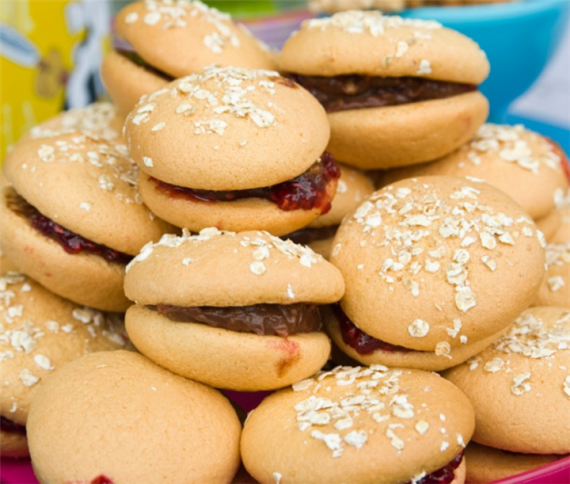 Υλικά Χάμπουργκερ 10 ασπράδια αυγών 10 κρόκοι αυγών 200 γρ. ζάχαρη 330 γρ. αλεύρι 4 γρ. μπέικιν πάουντερ σουσάμι ή νιφάδες βρόμης Γέμιση 200 γρ. σοκολάτα γάλακτος, τεμαχισμένη σε μικρά κομμάτια 150 γρ. κρέμα γάλακτος 35% λιπαρά 50 γρ. φουντούκια, καβουρδισμένα και ψιλοκομμένα μαρμελάδα φράουλα Χάμπουργκερ Στον κάδο του μίξερ χτυπάμε τους κρόκους με τη μισή ζάχαρη μέχρι να ασπρίσουν. Μεταφέρουμε σε άλλο μπολ και καθαρίζουμε καλά τον κάδο και τα χτυπητήρια. Στην συνέχεια χτυπάμε σε αυτόν τα ασπράδια με την υπόλοιπη ζάχαρη σε χαμηλή ταχύτητα, έως ότου γίνουν μια σφιχτή μαρέγκα. Ανακατεύουμε τη μισή από τη μαρέγκα με το μείγμα των κρόκων και προσθέτουμε το αλεύρι μαζί με το μπέικιν πάουντερ. Προσθέτουμε και την υπόλοιπη μαρέγκα. Πάνω σε μία λαδόκολλα δημιουργούμε κύκλους διαμέτρου 5-6 εκ. με ένα ίσιο, φαρδύ κορνέ (χωρίς δοντάκια). Πασπαλίζουμε την επιφάνειά τους με σουσάμι ή νιφάδες βρόμης και ψήνουμε σε προθερμασμένο φούρνο στους 190°C έως ότου πάρουν χρυσαφί χρώμα (περίπου 10-12 λεπτά). Γέμιση Ζεσταίνουμε την κρέμα γάλακτος και τη ρίχνουμε πάνω από την ψιλοκομμένη σοκολάτα. Κάνουμε καλή ομογενοποίηση και προσθέτουμε και το ψιλοκομμένο φουντούκι. Αφήνουμε να κρυώσει και να σταθεροποιηθεί ελαφρώς. Συναρμολόγηση Κόβουμε τα χάμπουργκερ στη μέση. Αλείφουμε και στα δύο μισά λίγη μαρμελάδα φράουλα, βάζουμε στο ένα από αυτά λίγη από τη σοκολατένια γέμιση και σκεπάζουμε με το δεύτερο μισό.