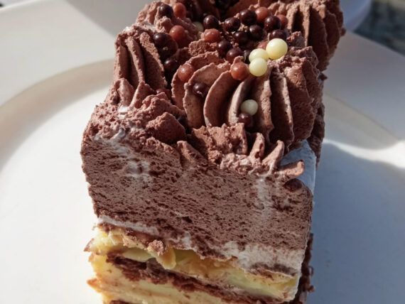 Συνταγή για μπισκοτόγλυκο με κάστερ πάουντερ. Αφράτο γλυκό ψυγείου με μπισκότα, κρέμα βανίλιας και σαντιγί σοκολάτα – βανίλια από την Τζένη Τσανακτσίδου.
