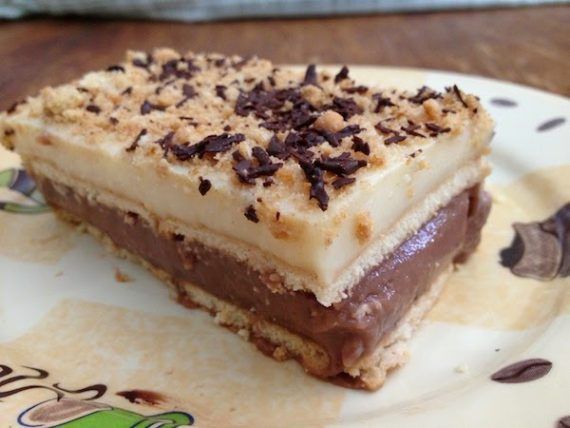 Εκτέλεση: Σε ένα πυρέξ ή άλλο βαθύ σκεύος (25×15) στρώνουμε τα μισά μπισκότα. Δεν χρειάζεται να τα μουλιάσουμε γιατί θα πέσει καυτή πάνω τους η κρέμα και θα μαλακώσουν όσο πρέπει! Ετοιμάζουμε την κρέμα με άρωμα κακάο πρώτα και τη ρίχνουμε αμέσως πάνω στα στρωμένα μπισκότα. Απλώνουμε και τα υπόλοιπα σε μια ακόμα στρώση και ετοιμάζουμε αμέσως την κρέμα με άρωμα μπανάνας. Την απλώνουμε κι αυτή από πάνω . Ενώνουμε τα τριμμένα μπισκότα με τις νιφάδες κουβερτούρας και πασπαλίζουμε την επιφάνεια του γλυκού. Θέλουμε να πετύχουμε μια παχιά στρώση , η οποία θα κάνει μια πολύ ωραία κρούστα. Το βάζουμε στο ψυγείο για να κρυώσει για λίγες ώρες και είναι πανέτοιμο και ωραιότατο!