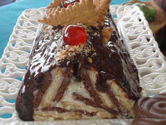 Απλώνουμε μία πλαστική μεμβράνη στον πάγκο μας και βάζουμε 3 μπισκότα στο μήκος και 4 μπισκότα στο πλάτος. Τα μπισκότα μας στο σύνολο είναι 12. Βάζουμε μία στρώση κρέμας, μία στρώση μπισκότα σοκολάτας, άλλη μία στρώση κρέμας και άλλη μία στρώση κλασικών μπισκότων.