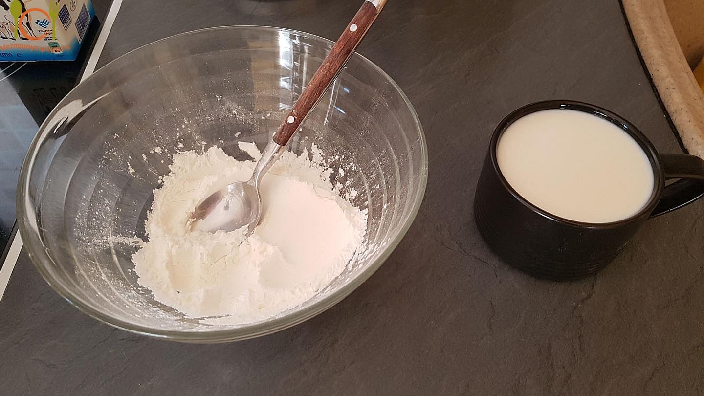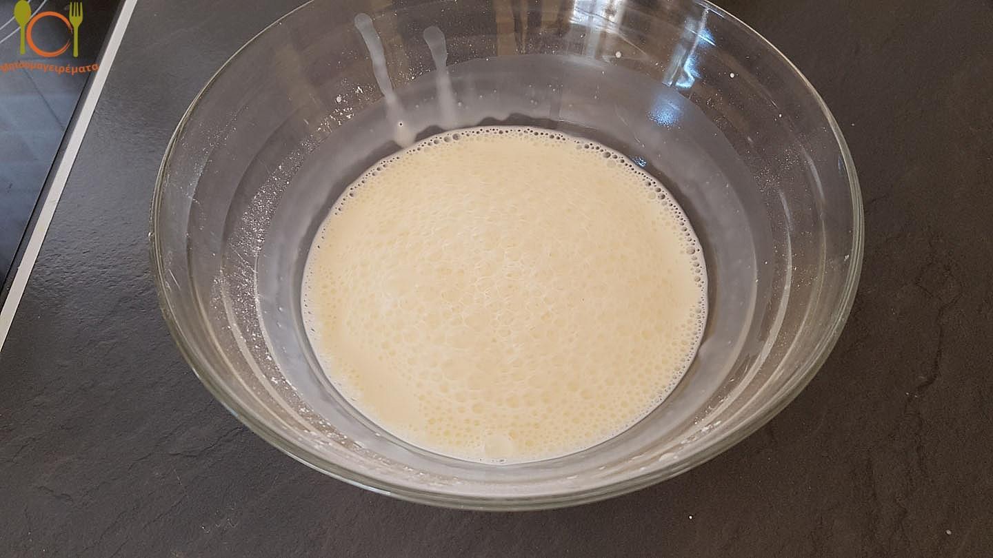 Αρχικά, πρέπει να διαλύσουμε το κάστερ πάουντερ (ή άνθος αραβοσίτου) σε 1 φλιτζάνι γάλα. Οπότε σε ένα μπολάκι βάζουμε 5 με 6 μεγάλες κουταλιές κάστερ πάουντερ και 1 φλιτζάνι γάλα. Το χτυπάμε με ένα σύρμα, μέχρι να διαλυθεί καλά!