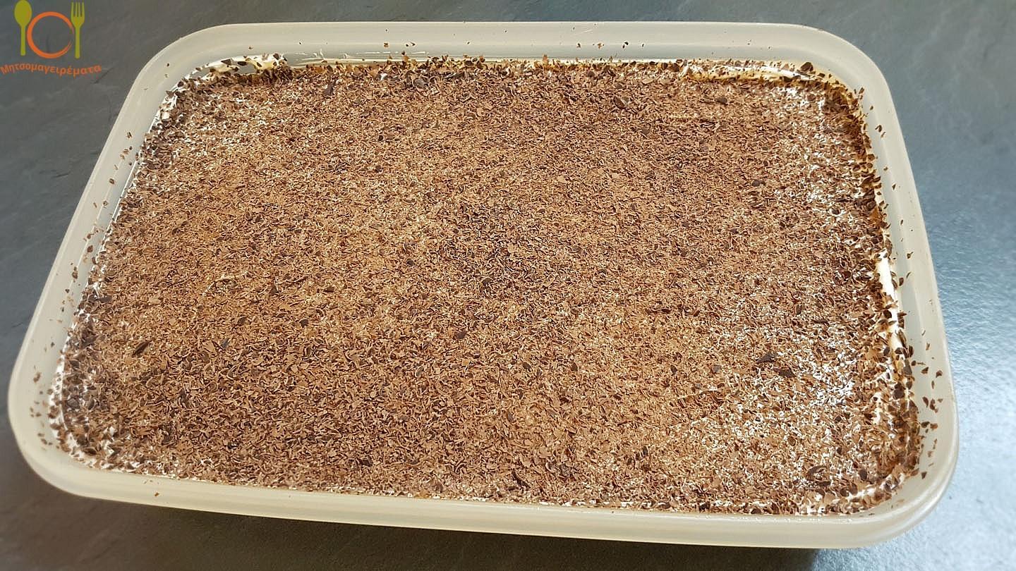 Αφού κρυώσει λίγο το μείγμα της σοκολάτας, ρίχνουμε τα σπασμένα μπισκότα, τα ανακατεύουμε όλα μαζί και τα αδειάζουμε σε ένα τάπερ – ταψί. Απλώνουμε και τη σαντιγί και το γλυκάκι μας είναι σχεδόν έτοιμο. Το βάζουμε στο ψυγείο για 2 ώρες περίπου, μέχρι να κρυώσει. Όταν έρθει η ώρα να σερβίρουμε, τρίβουμε λίγη κουβερτούρα από πάνω και είμαστε έτοιμοι να απολαύσουμε!!!