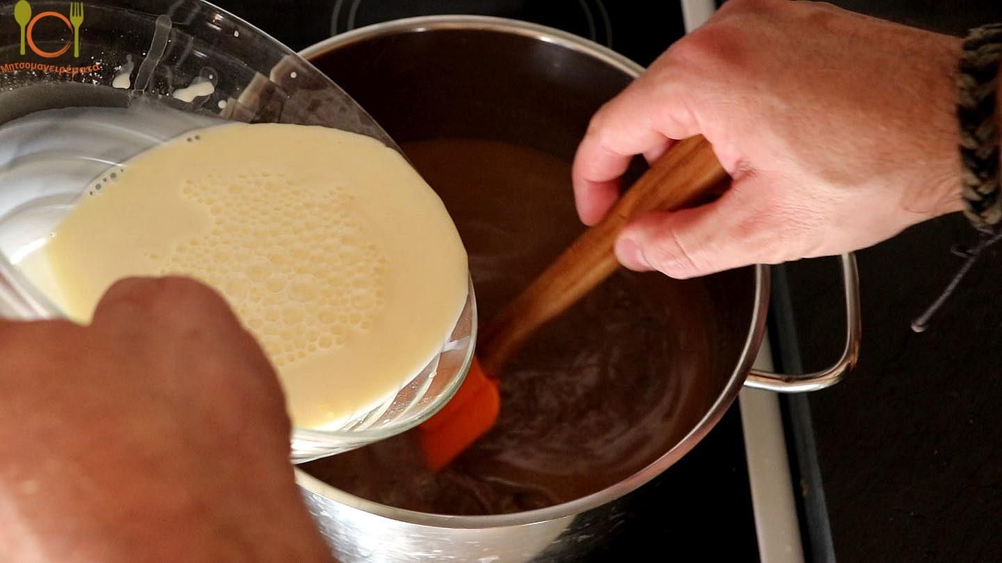 Σε μια μεγάλη κατσαρόλα, βάζουμε μέσα το βούτυρο, τη ζάχαρη, τη κουβερτούρα, το υπόλοιπο γάλα (1 λίτρο γάλα θα χρειαστούμε συνολικά) και τα ανακατεύουμε συνέχεια, μέχρι να λιώσουν! Όταν γίνει αυτό, ρίχνουμε το μείγμα με το γάλα και το κάστερ πάουντερ και το ανακάτεμα συνεχίζεται… Μην χαμηλώσετε αμέσως την ένταση της κουζίνας. Να πήξει λίγο το μείγμα και μετά.