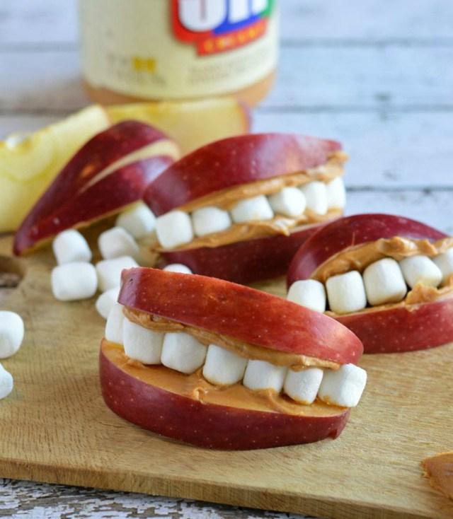Θα χρειαστείτε κόκκινα μήλα, μικρά marshmallows και φυστικοβούτυρο (που θα κρατήσει τα «δόντια» κολλημένα στο «στόμα»).