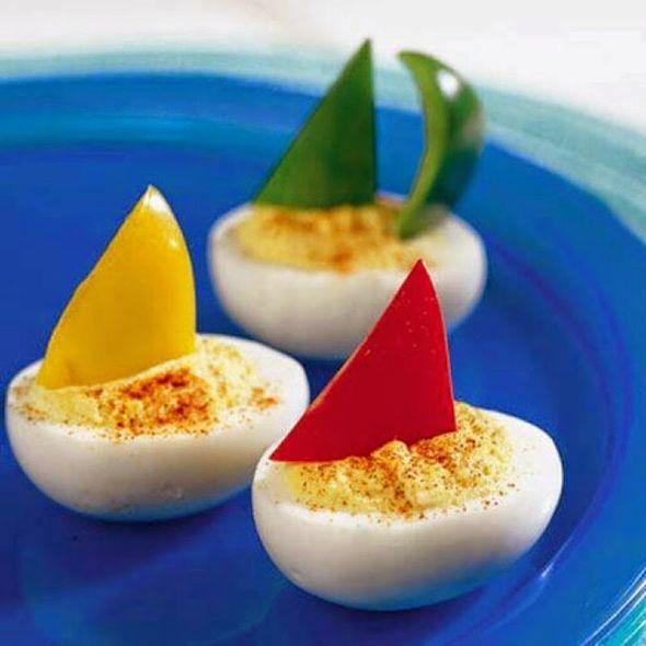 Βράστε καλά τα αυγουλάκια και κόψτε τα στη μέση. Τοποθετήστε τα με το κοίλο μέρος προς τα κάτω και καρφώστε τους πανάκια από χρωματιστές πιπεριές σε κατάρτι από οδοντογλυφίδα.