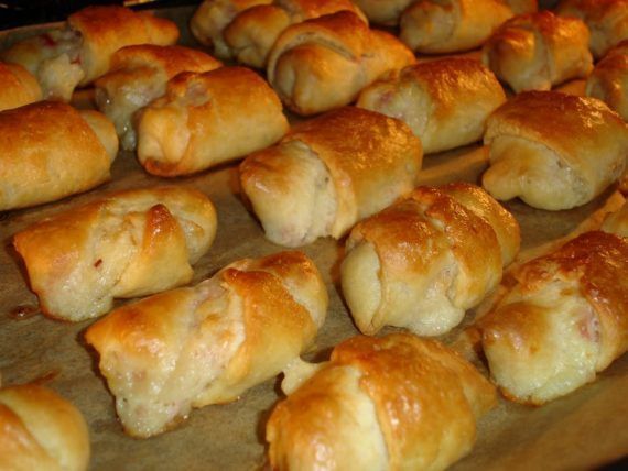Εκτέλεση Ενώνουμε όλα τα υλικά (της ζύμης) και κάνουμε μία πολύ ελαστική ζύμη. Την αφήνουμε να “ξεκουραστεί” για 20 λεπτά, τη χωρίζουμε σε 5 μπαλάκια και ανοίγουμε φύλλο στρογγυλό ή σαν μία πίτσα, με τα χέρια μας. Τη χωρίζουμε σε 8 κομμάτια, βάζουμε μία κουταλιά γέμισης στο καθένα και τα τυλίγουμε σαν κρουασανάκια. Αλοίφουμε με αυγό και τα ψήνουμε στο φούρνο μέχρι να ροδίσουν.