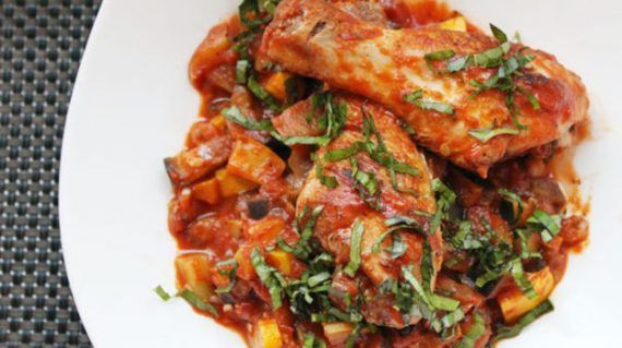 Υλικά συνταγής 8 μηρούς κοτόπουλου (μόνο τα ποδαράκια, όχι ολόκληρο το μπούτι) 1/3 φλ. τσαγιού ελαιόλαδο 1 μέτριο ξερό κρεμμύδι, κομμένο σε μικρούς κύβους 2 σκελίδες σκόρδο, κομμένο σε φετούλες 1 κόκκινη (ή κίτρινη) πιπεριά, κομμένη σε μικρούς κύβους 2 μελιτζάνες φλάσκες, κομμένες σε μέτριους κύβους 3 μέτρια κολοκυθάκια, κομμένα σε μέτριους κύβους 2 μέτριες πατάτες, κομμένες σε μέτριους κύβους 1 σπιτικό ζωμό κότας ή λαχανικών, διαλυμένο σε ½ φλ. βραστό νερό 2 κουτιά ντοματάκια κονκασέ 1 κ.σ. πελτές ντομάτας 1 κ.γ. ζάχαρη αλάτι πιπέρι 5 κ.σ. ψιλοκομμένο φρέσκο μαϊντανό + λίγο επιπλέον για πασπάλισμα