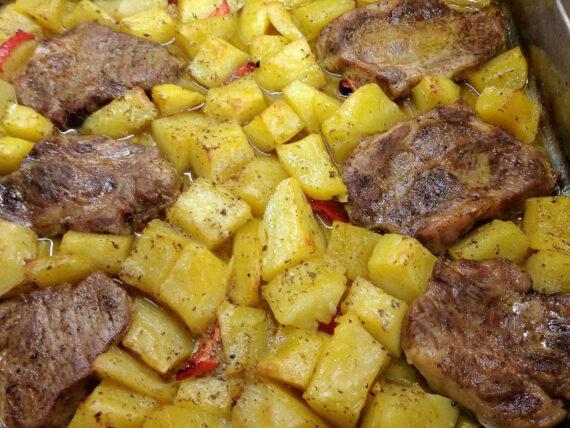 Συνταγή για μαλακές χοιρινές μπριζόλες λουκούμι, με πατάτες φούρνου . Με κουρκουμά, πάπρικα, μουστάρδα και το μυστικό να βγουν καλοψημένες.