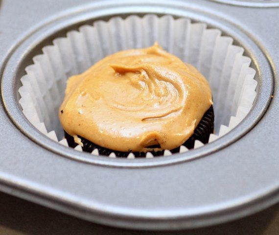 1. Προθερμαίνουμε τον φούρνο στους 180 C. βαθμούς. 2. Πάνω σε κάθε μπισκότο oreo, βάζουμε από ένα κουταλάκι του γλυκού φυστικοβούτυρο.