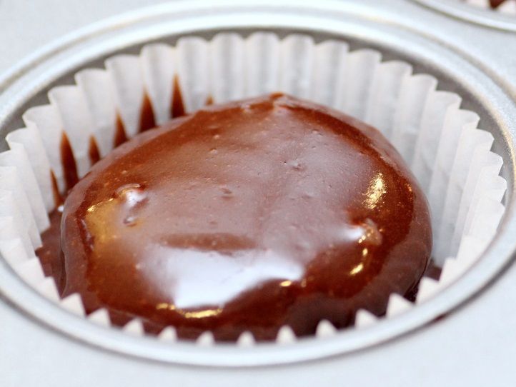 4. Βουτυρώνουμε τα cupcake, ή την φόρμα muffin, και τοποθετούμε από ένα “σάντουιτς” μπισκότο σε κάθε cupcake, και πασπαλίζουμε από πάνω λίγες σταγόνες κουβερτούρα.