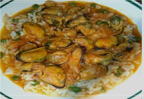 2 μεγάλα κρεμμύδια ελαιόλαδο 2 ποτήρια κρασί 1 κιλό μύδια ρύζι Πελτές 2 κουταλιές σούπας ή σάλτσα ντομάτας