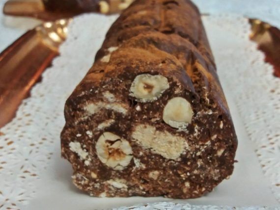 Προσθέτουμε τα φουντούκια (καβουρντισμένα είναι υπέροχα) και τα αμύγδαλα και ανακατεύουμε καλά το μείγμα. Τέλος, κόβουμε σε μικρά κομμάτια τον χαλβά, τον προσθέτουμε και ανακατεύουμε καλά με σπάτουλα. Παίρνουμε μία λαδόκολλα και απλώνουμε κατά μήκος όλο το μείγμα μέσα.