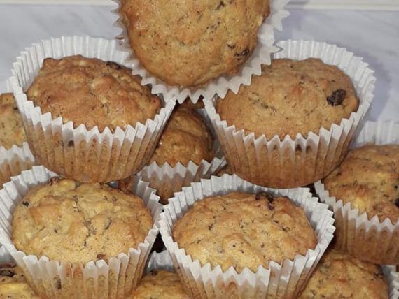 Το μίγμα είναι αρκετά παχύρευστο, μην σας φοβίσει. Βάζουμε τα χαρτάκια για muffins στις ειδικές θήκες για muffins και προσθέτουμε 1 κουταλιά της σούπας από το μείγμα, γεμάτη στο καθένα. Ψήνουμε σε καλά προθερμασμένο φούρνο στις αντιστάσεις στους 180 βαθμούς Κελσίου για 25-30 λεπτά.