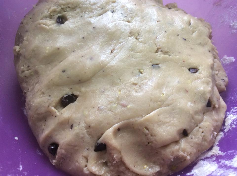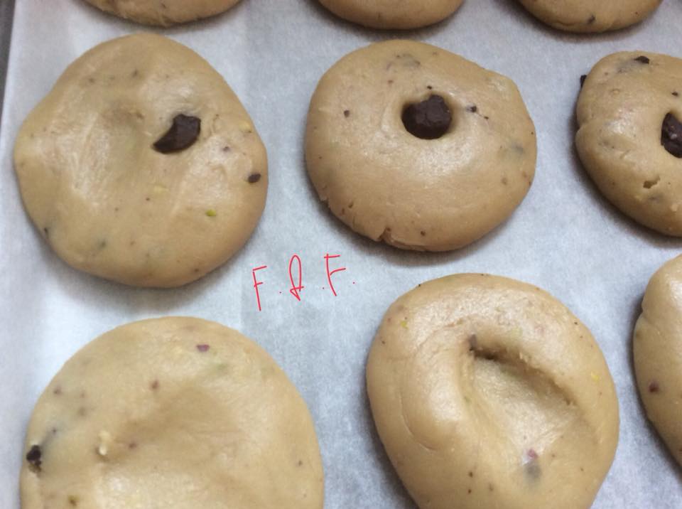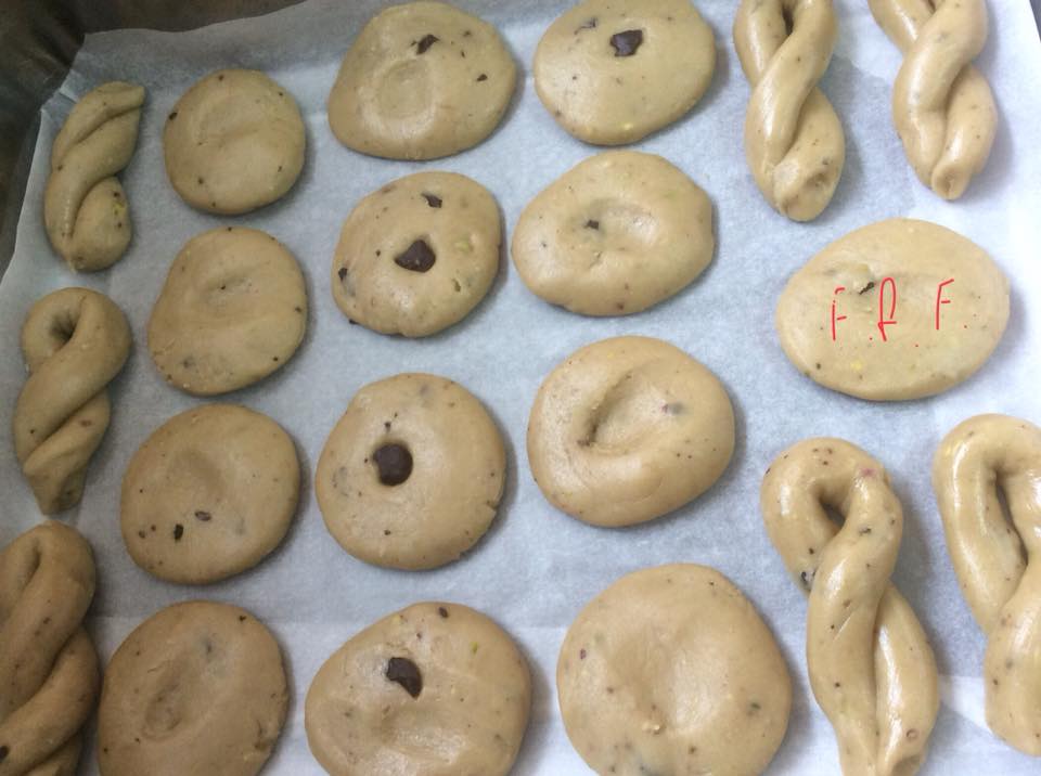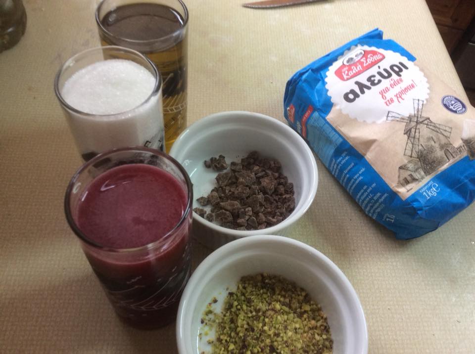 Χτύπησα καλά την ζάχαρη με το λάδι, πρόσθεσα το ρόδι με τη σόδα διαλυμένη μέσα, τα φυστικιά, την καρύδα και σταδιακά το αλεύρι με το μπεικιν μέχρι να γίνει μια μαλακή ζύμη. Θα είναι σκούρα η ζύμη από το ρόδι. Πρόσθεσα και την κουβερτούρα και ζύμωσα απαλά. Έπλασα τα κουλουράκια, τα έβαλα σε λαδόκολλα στο ταψί και έψησα στις αντιστάσεις στους 180 βαθμούς για περίπου μίση ώρα. Μου βγήκαν 35 κομμάτια μεγάλα όμως. Αν τα κάνετε πιο μικρά, ίσως βγουν πάνω από 50. Δοκιμάστε τα και είμαι σίγουρη ότι θα σας αρέσουν.