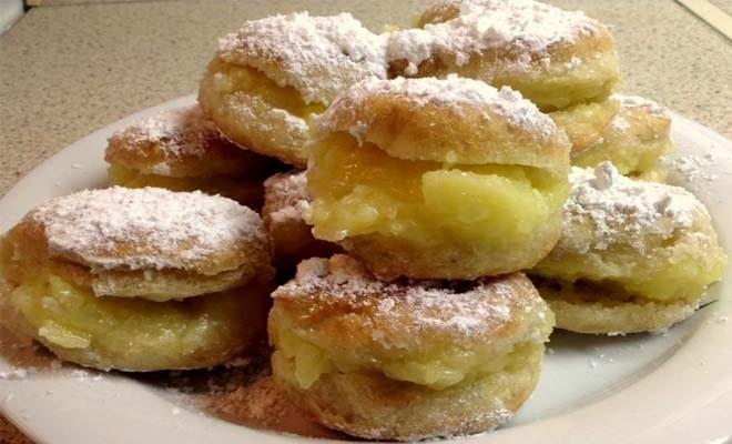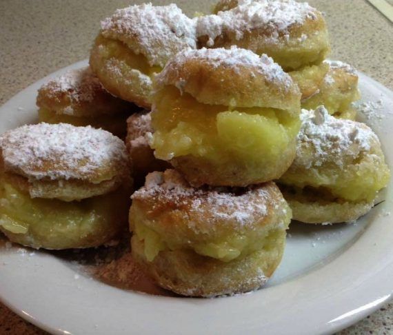 Βάζουμε σε μία κατσαρόλα εκτός φωτιάς τα 350γραμ νερο τα 100γρ κορν φλάουρ 200γρ ζάχαρη μια βανίλια και ανακατεύουμε. Το βάζουμε στη φωτιά συνεχίζοντας το ανακάτεμα ,μόλις αρχίσει να δένει ρίχνουμε 100ml χυμό πορτοκαλι χαμηλώνουμε τη φωτιά και ανακατεύουμε μέχρι να δέσει. Αφαιρούμε από τη φωτιά και ρίχνουμε ενα κουταλάκι μαργαρίνη. Η κρέμα θα περισσέψει και τρώγεται άνετα με κουτάλι. Κόβουμε μπαλάκια από τη ζύμη μας τηγανίζουμε χαράζουμε με μαχαίρι στη μέση οριζόντια με ενα κουτάλακι τα γεμίζουμε με την κρέμα και τα σκεπάζουμε με λίγη άχνη ζάχαρη .Καλή επιτυχία !! Συνταγή από την φίλη μου Ζουζουνιες