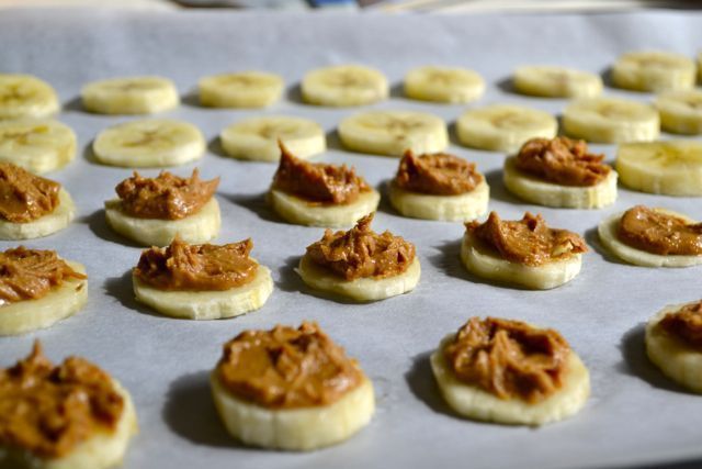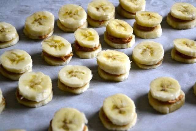 Πώς θα τα φτιάξεις Κόβεις τις μπανάνες σε ροδέλες πάχους περίπου 2 εκατοστών. Δύο μέτριου μεγέθους μπανάνες είναι αρκετές για περίπου 16-18 τέτοιες ροδέλες. Τις βάζεις σε ένα ταψάκι που έχεις καλύψει με λαδόκολλα και καλύπτεις τις μισές ροδέλες με λίγο φυστικοβούτυρο. Πάνω από το φυστικοβούτυρο, βάζεις μία ροδέλα από τις άλλες μισές (να γίνουν σαν «σάντουιτς»). Βάζεις τις μπανάνες στην κατάψυξη για μία ώρα. Λιώνεις την κουβερτούρα σε μπεν μαρί ή στο φούρνο μικροκυμάτων και βουτάς μέσα κάθε «σαντουιτσάκι» μπανάνας γυρνώντας το ώστε να καλυφθεί από όλες τις πλευρές με τη βοήθεια μιας οδοντογλυφίδας. Ακουμπάς τα σοκολατάκια πάλι σε λαδόκολλα και τα βάζεις στο ψυγείο για 1 ώρα (να σκληρύνει η σοκολάτα).