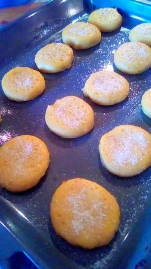 Την σκεπάζουμε για 15 λεπτά. Στην συνέχεια την τοποθετούμε στον πάγκο μας και την ανοίγουμε ένα παχύ φύλλο (1 εκατοστού) κόβουμε δισκάκια με το στόμιο ενός ποτηριού. Τα τοποθετούμε σε λαδωμένο ταψί, τα τρυπάμε με οδοντογλυφίδα, ρίχνουμε πάνω ζάχαρη και τα ψήνουμε στους 200 βαθμούς για 10 λεπτά. Φυσικά ανάλογα τον φούρνο. Τα υλικά τα μετράμε όλα με το ίδιο ποτήρι.