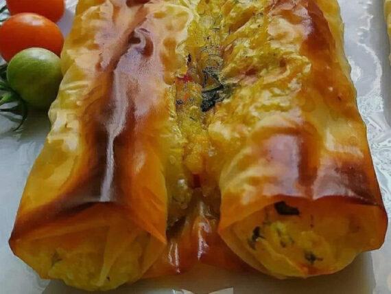 Το διπλώνουμε και βάζουμε αριστερά και δεξιά στις άκρες μείγμα από τις πατάτες και γυρνάμε το κάτω και το πάνω μέρος του φύλλου προς τα μέσα. Ρολάρουμε και από την δεξιά και από την αριστερή πλευρά προς τα μέσα. Αλείφουμε ελαφρώς με ένα πινέλο και ηλιέλαιο και ρολάρουμε και πάλι μέχρι μέσα.