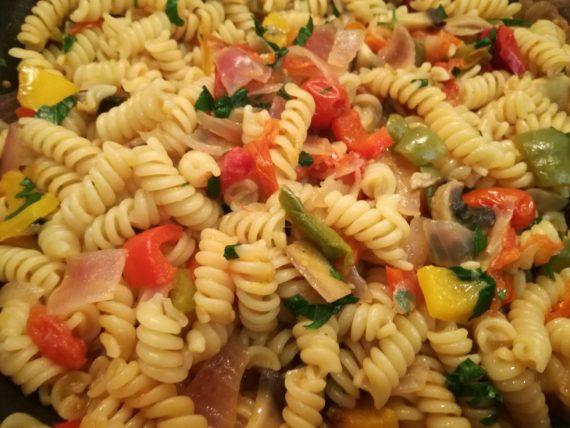 Υλικά 1/2 συσκευασία βίδες ζυμαρικά Περίπου μία κούπα σε κυβάκια χρωματιστές πιπεριές 1 μεγάλο κόκκινο κρεμμύδι 1-2 μέτρια Μανιτάρια 5-7 ντοματίνια 1 σφηνάκι ελαιόλαδο 1/2 κούπα λευκό κρασί Περίπου 2 κούπες καυτό νερό Αλάτι Πιπέρι μαϊντανός Σκόρδο σε σκόνη