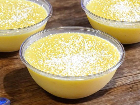 Clean the pineapple and cut it into pieces. Put it in the blender along with the coconut milk and grind. Strain the mixture into a saucepan, add the cornstarch and boil until it thickens. Place in 6 bowls and refrigerate until completely cool. Optionally sprinkle with coconut.