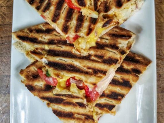Σκεπάστε τις πίτες μεταξύ τους και ψήστε στην τοστιέρα για μερικά λεπτά. Ανοίξτε τις πίτες και βάλτε την ντομάτα και την σώς και σκεπάστε. Κόψτε στα 4 και απολαύστε την πιο light, vegan σκεπαστή.