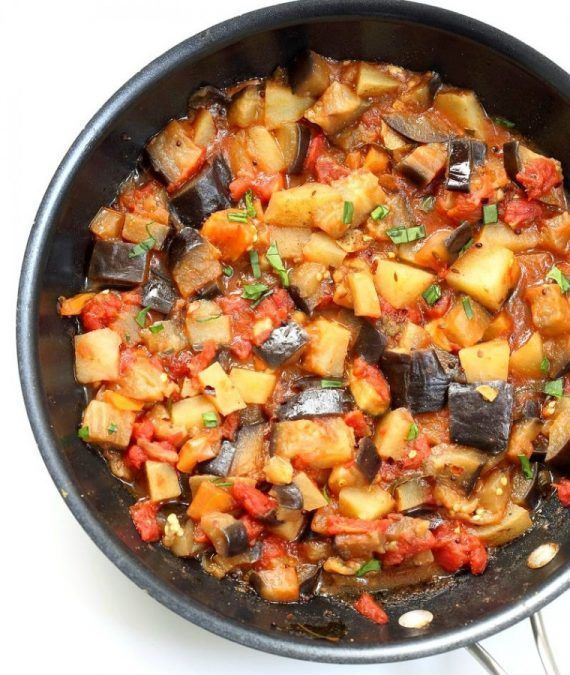 Προθερμαίνουμε το φούρνο στους 200 βαθμούς στον αέρα. Κόβουμε τις μελιτζάνες σε χοντρά κομμάτια. Τις αραδιάζουμε σε λαμαρίνα και τις ραντίζουμε με ελάχιστο ελαιόλαδο. Τις ψήνουμε σε δυνατό φούρνο για 15΄ να καψαλιστούν. Όταν μισομαλακώσουν οι πατάτες, προσθέτουμε στην κατσαρόλα τις ψημένες μελιτζάνες και το υπόλοιπο ελαιόλαδο. Σιγοβράζουμε για επιπλέον 15′.