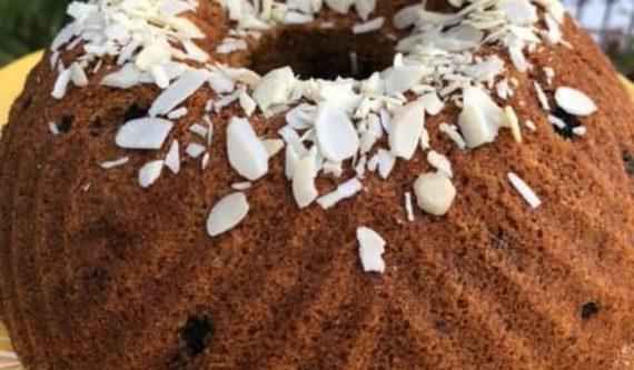 Αφού το μείγμα μας είναι έτοιμο το αδειάζουμε σε μία βουτυρωμένη φόρμα για κέικ. Ψήνουμε το κέικ μας για 50 λεπτά στους 180 βαθμούς Κελσίου. ο Χρόνος ψησίματος διαφέρει ανάλογα τον φούρνο που διαθέτουμε. Σερβίρουμε σε πιατέλα μόλις ψηθεί και το γαρνίρουμε με αμύγδαλο φιλέ.