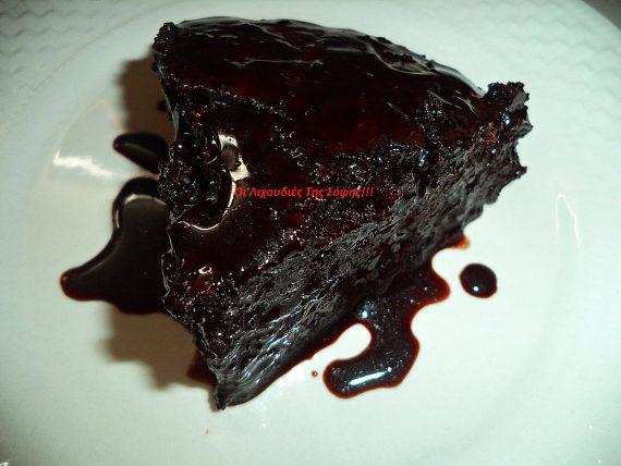 ΕΚΤΕΛΕΣΗ -Ανακατεύω όλα μαζι τα υλικα σ ένα μπολ και αδειάζω σε 26 νουμ. ταψάκι λαδωμένο με λαδόκολα και ψήνω στους 180 βαθμούς για 30 λεπτά περίπου. Οταν βγει όπως ειναι ζεστό το χαράζω σε κομμάτια και το περιχυνω με όσο θέλω σιρόπι σοκολάτας!
