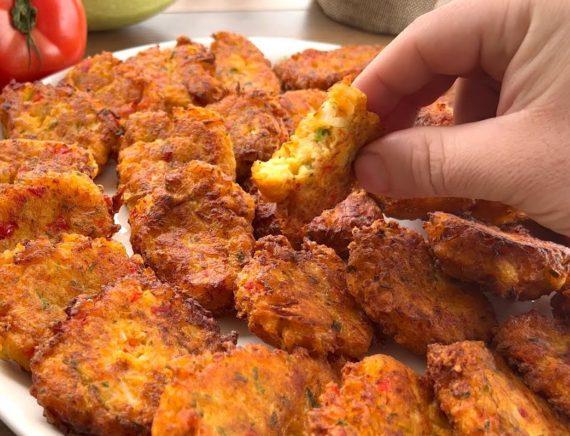 600 g cauliflower 1 medium onion 1 tomato 1 zucchini 1 red pepper A little parsley 250 g self raising flour 1 tsp sweet paprika 1/2 tsp garlic powder 1,5 tsp salt Oregano pepper 2 tbsp olive oil 1 tbsp mustard —————————————– Vegetable oil