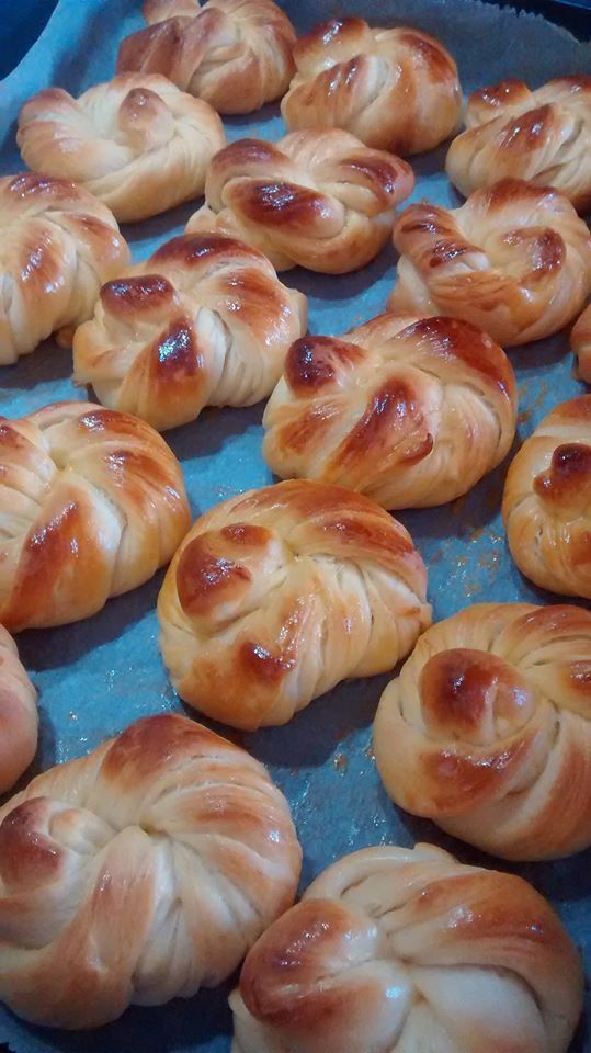 Ανακατεύουμε το νερό με τη ζάχαρη και τη μάγια να λιώσει,προσθέτουμε όλα τα υλικά μαζί και κάνουμε ζύμη μπαλάκια να μη κολλάει στα χέρια μας. Αφήνουμε να φουσκώσει σε ζεστό μέρος για 1 ώρα περίπου όπου να διπλασιάσει. Παίρνουμε το ζυμάρι και το χωρίζουμε σε 2 μέρη, το ανοίγουμε σε μακρόστενο σχήμα και το αλείφουμε με το μισό βιτάμ(σε θερμοκρασία δωματίου) και το διπλώνω στα τρία, κόβουμε λωρίδες τραβάμε και δένουμε κόμπο. Ψήνουμε σε προθερμασμένο φούρνο στους 180’βαθμούς για 15 λεπτά.