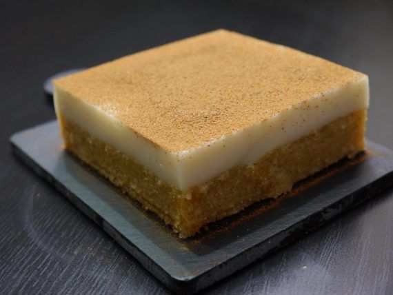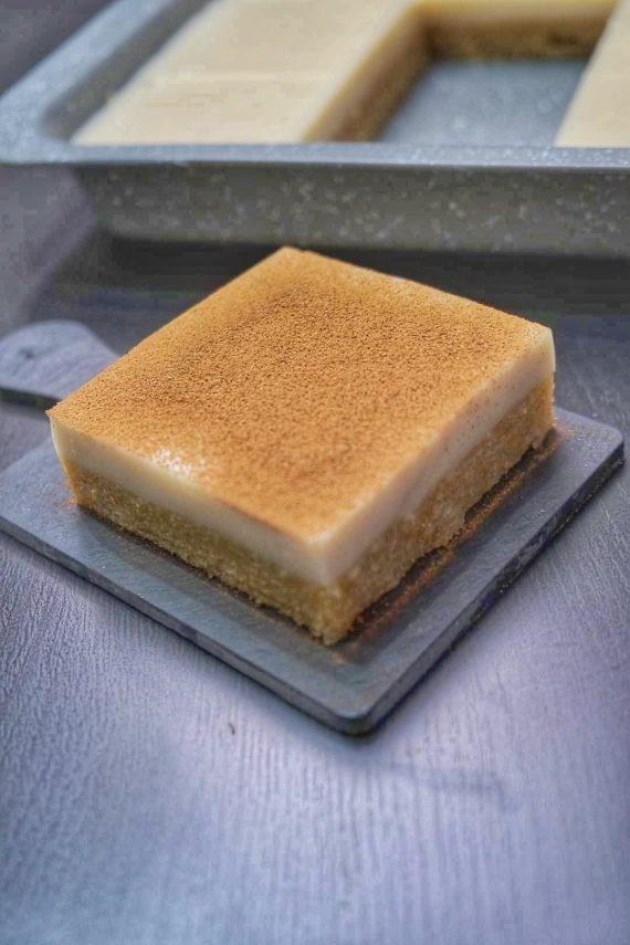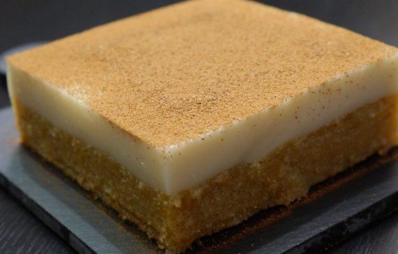 English Ingredients 200 g thick semolina 170 g fine semolina 400 g sugar 600 g orange juice 230 g water Zest from 1 orange 1 litre almond milk 80 g cornstarch 2 vanilins 150 g sugar Cinnamon powder **25×30 cm