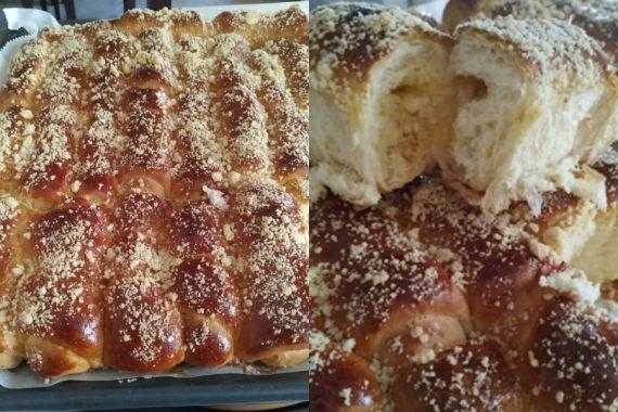 Τυλίγουμε το κάθε μπαλάκι σε ρολό και τα απλώνουμε στην φόρμα ψησίματος. Αφήνουμε για 20 λεπτά να φουσκώσουν κι έπειτα τα αλείφουμε με ένα αυγό και τα πασπαλίζουμε με το υπόλοιπο μείγμα από την ζάχαρη, Ψήνουμε σε προθερμασμένο φούρνο, στις αντιστάσεις, στους 170 βαθμούς Κελσίου για 30-35 λεπτά.