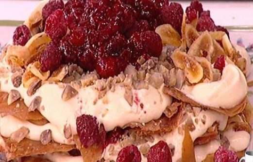 Βάζουμε τα βατόμουρα σε ένα κατσαρολάκι με την ζάχαρη και μερικές σταγόνες λεμόνι και ανακατεύουμε έως ότου δέσει. Στο τέλος σε μια μεγάλη πιατέλα τοποθετούμε μια στρώση φύλλα προσθέτουμε την κρέμα μας σε ένα κορνέ και καλύπτουμε την επιφάνεια με μια στρώση κρέμα. Προσθέτουμε κομμένα αποξηραμένα σύκα και ψιλοκομμένα κάστανα. Στην συνέχεια προσθέτουμε μια στρώση φύλλα ξανά κρέμα σύκα και κάστανα. Στο τέλος βάζουμε τα τελευταία φύλλα και την υπόλοιπη κρέμα και γαρνίρουμε με τα υπόλοιπα σύκα τα κάστανα τρίβουμε λίγα φύλλα τη σάλτσα βατόμουρο και άχνη ζάχαρη. Σερβίρουμε!