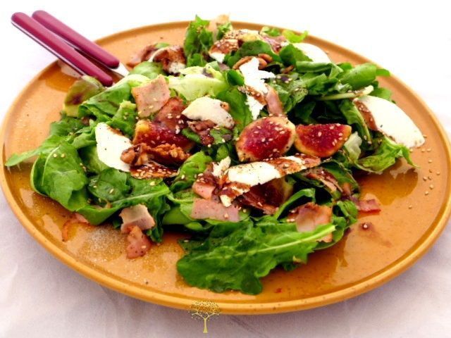 Σαλάτα με ρόκα, σύκα, καρύδια, μπέικον, παρμεζάνα