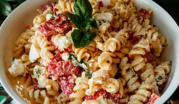 Μακαρονοσαλάτα με λιαστή ντομάτα, πιπεριές ψημένες στο βάζο, φέτα και μερικά ακόμη απλά υλικά.