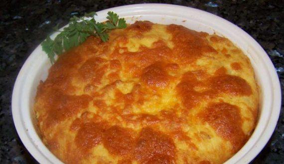 7. Χτυπήστε τα ασπράδια σε ένα καθαρό μπολ μέχρι να γίνουν μαρέγκα. Ρίξτε τη μισή ποσότητα της μαρέγκας στη κρέμα και ανακατέψτε τη πολύ απαλά, ρίξτε και την υπόλοιπη μαρέγκα ανακατέψτε τη να γίνει όλο μαζί ένα αφρώδες μίγμα και αδειάστε το στη βουτυρωμένη φόρμα.