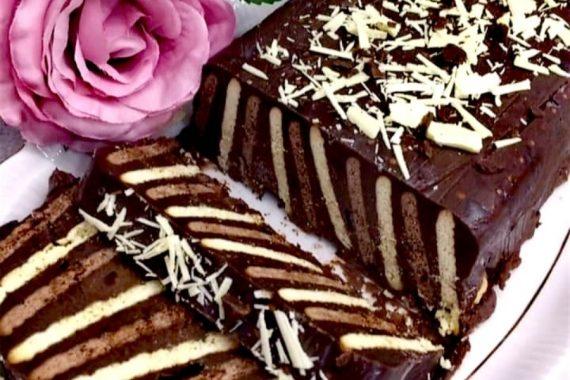 Νόστιμος κορμός σοκολάτας με ριγέ σχέδιο. Ένας υπέροχος και πρωτότυπος κορμός σοκολάτας! Είναι φυσικά πεντανόστιμος κορμός και το ιδιαίτερο και πρωτότυπο σχέδιο του, τον κάνει ιδανικό για να εμπλουτίσετε τον γιορτινό σας μπουφέ.