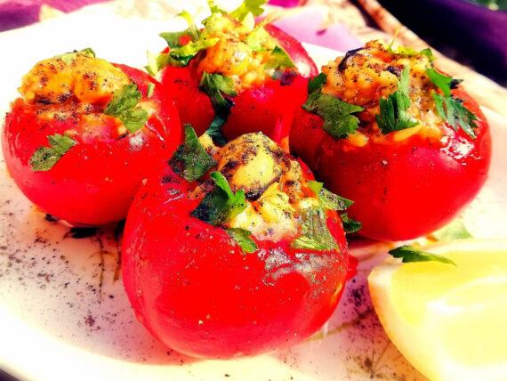 Συνταγή για τα γεμιστά της Σαρακοστής με ντομάτες γεμισμένες με ρύζι και μύδια, για το μεσημεριανό μας.