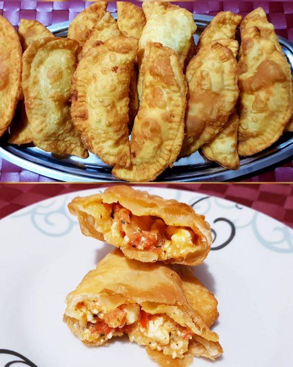 Ετοιμάζουμε την γέμιση… Βάζουμε σε ένα τηγάνι λίγο ελαιόλαδο να κάψει… Ρίχνουμε το κρεμμύδι και το σοτάρουμε μέχρι να γίνει διάφανο… προσθέτουμε τις ντομάτες, τον δυόσμο, λίγο αλάτι, πιπερι και αφήνουμε να βρασουν μέχρι να εξαφανιστούν ολα τα υγρά της γέμισης… Μόλις γίνει την αφήνουμε στην άκρη να χλιαρεψει και προσθέτουμε την φέτα σε κομμάτια… Παίρνουμε μια μπαλίτσα από την ζύμη μας την Ανοίγουμε, Με το πιατάκι του καφέ το κόβουμε σε κύκλους. Βάζουμε στη μια άκρη μια γεμάτη κουταλιά από τη γέμιση και κλείνουμε διπλώνοντας…