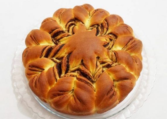 Με το μαχαίρι κόβουμε το τσουρεκόψωμο στα τέσσερα, χωρίς να φτάνουμε μέχρι το κέντρο του ταψιού. Στο σημείο αυτό, το τσουρεκόψωμο θα μείνει ενωμένο.