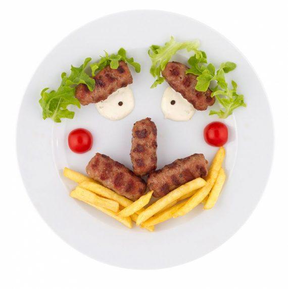 Βάζουμε σε ένα άσπρο πιάτο τρία μπιφτεκάκια, όπως στη φωτογραφία για τη «μύτη» και το περίγραμμα του «προσώπου» και δύο από πάνω για τα «φρύδια».