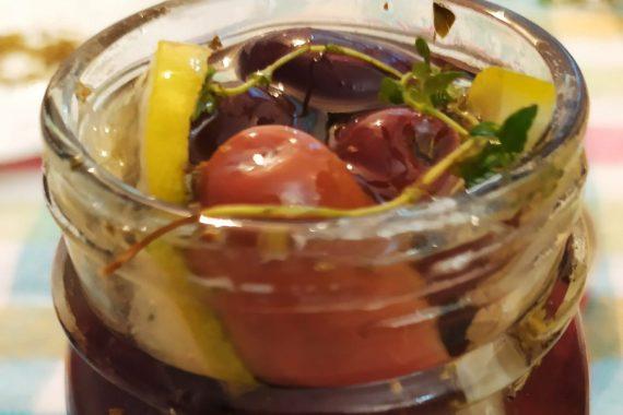 Ανοίγουμε την γυάλα, βάζουμε τις ελιές κι αν θέλουμε βάζουμε ένα κομμάτι λεμόνι, ένα φύλλο φρέσκο θυμάρι και ξύδι, ρίγανη και συμπληρώνουμε με ηλιέλαιο ή ελαιόλαδο.