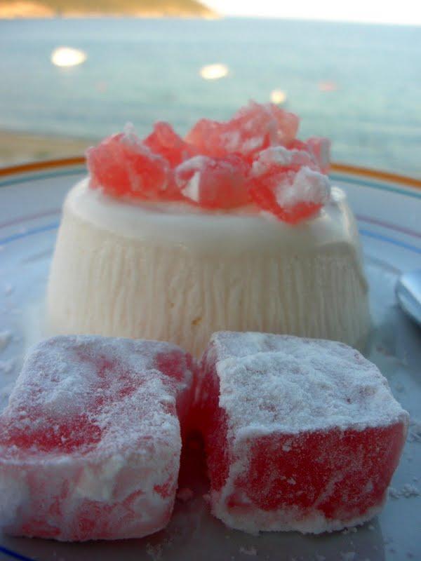 375 ml (1.5 φλ.τσ.) γάλα 500 ml (2 φλ.τσ.) κρέμα γάλακτος 150 γρ. (2/3 φλ.τσ.) ζάχαρη ψιλή 6 κρόκοι αβγών 100 γρ. λουκούμι της αρεσκείας σας