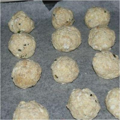 4) Σε ταψί στρώνουμε λαδόκολλα, αραδιάζομαι τα τυροκεφτεδάκια, δίνοντας τους το σχήμα που