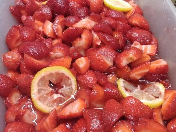 Αρχικά παίρνουμε τις φράουλες και τις κόβουμε σε μικρότερα κομμάτια. Αφαιρούμε τα κοτσάνια και τις ξεπλένουμε καλά. Τις βάζουμε σε ένα τάπερ και προσθέτουμε τον φυσικό χυμό πορτοκαλιού, την ζάχαρη και το κονιάκ. Ανακατεύουμε και προσθέτουμε τις φέτες λεμονιού.