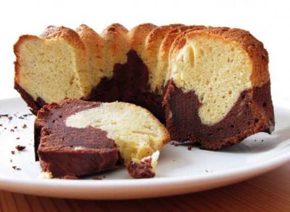 Βαζουμε το μισο μειγμα σε βουτυρωμενο στρογγυλο ταψι 28 εκ. και στο υπολοιπο μισο ανακατευουμε το κακαο κ το προσθετουμε κ αυτο στη φορμα του κεικ. Παιρνουμε ενα κουταλι κ μπερδευουμε ελαφρα τα δυο μειγματα.