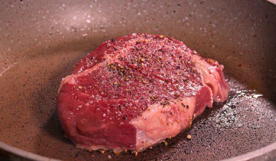 Αφού κάψει βάζουμε την μοσχαρίσια μπριζόλα στο αντικολλητικό τηγάνι και την ψήνουμε από κάθε πλευρά για 1 λεπτό.