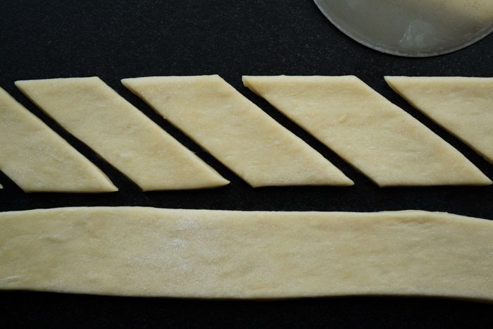 Κόβουμε διαγώνια κομμάτια 8-10 εκατοστών και πλάτους 2 περίπου εκατοστών, χαράζουμε το κέντρο κάθε κομματιού δημιουργώντας μια σχισμή.